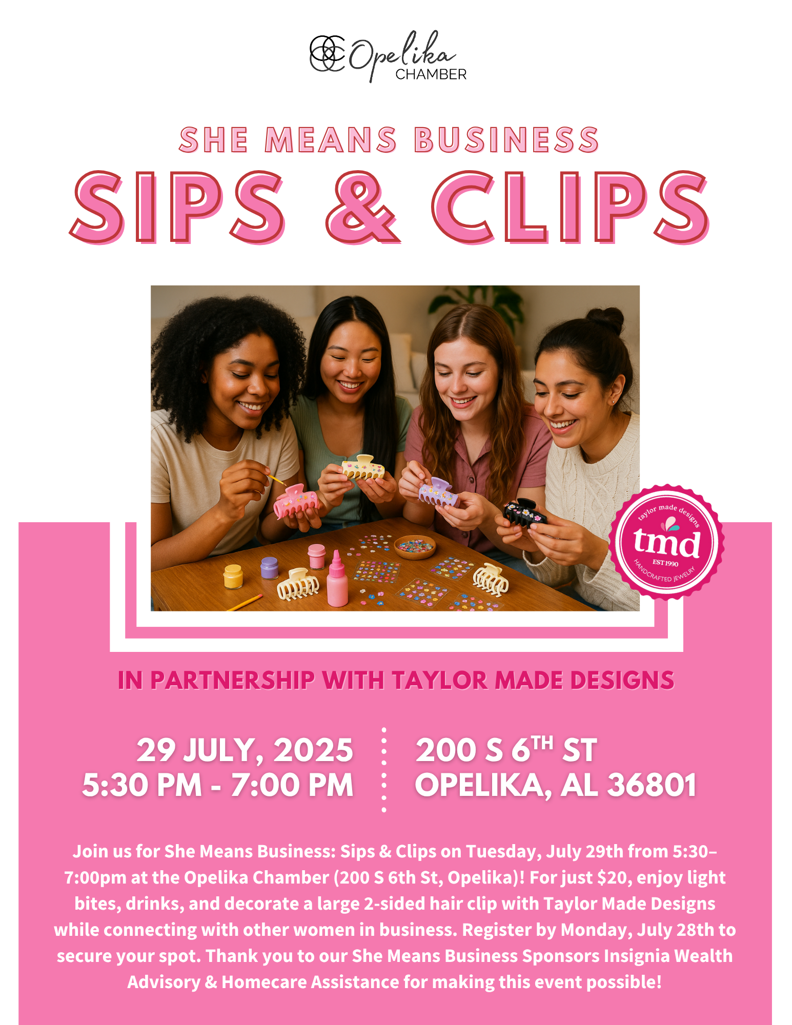 For just $20, enjoy light bites, drinks, and decorate a large 2-sided hair clip with Taylor Made Designs while connecting with other women in business.