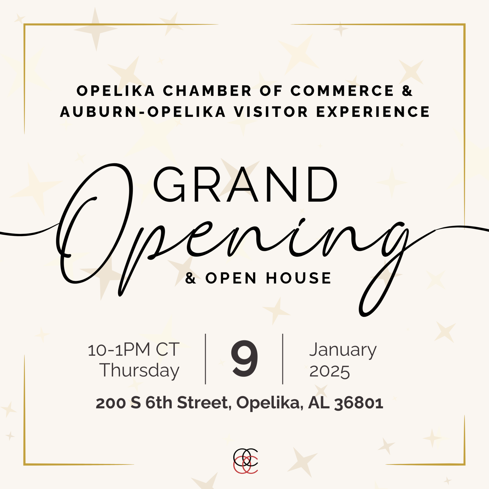 DESCRIPTION:Join us on Thursday\, January 9th\, at 10am for the Grand Opening & Open House of the Opelika Chamber's New Building and Auburn-Opelika Visitor Experience\, located at 200 S 6th Street\, Opelika\, AL 36801! The day will begin with a short program and ribbon cutting at 10am CT\, visitors can also drop-in between then and 1pm CT to explore all the incredible features of our new space. Get your first look at the Auburn-Opelika Visitor Experience\, showcasing epic digital interactive elements\, and tour the Opelika Chamber's new building\, including its state-of-the-art training center and much more. This is a monumental moment for our community\, and we are thrilled to share it with you. Mark your calendars and celebrate this historic day with us!