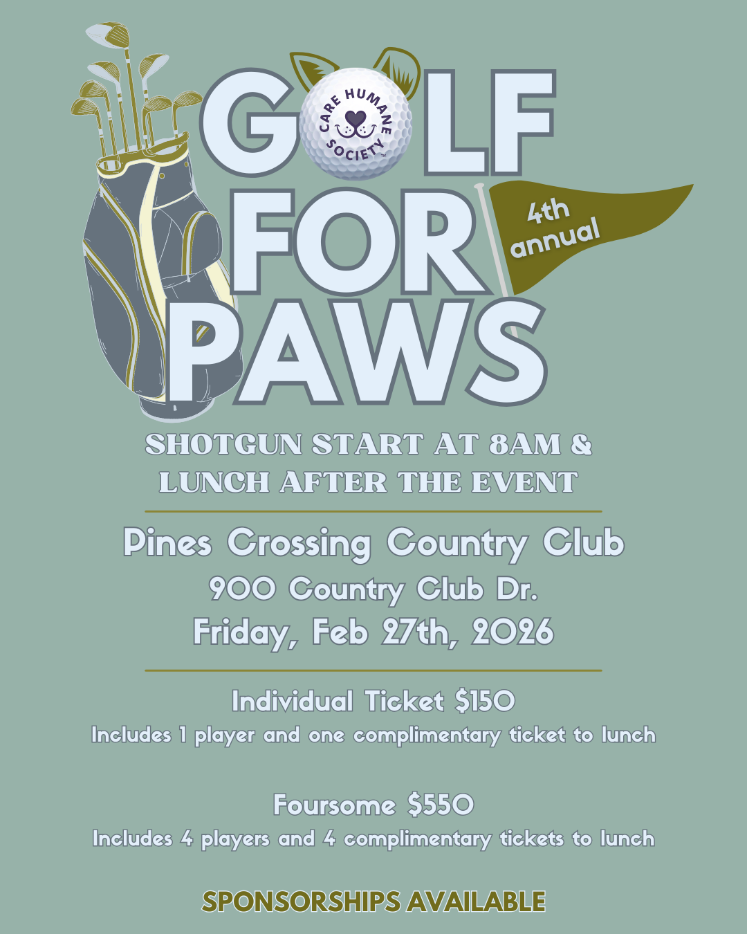 CARE Humane Society is excited to invite you to join or sponsor our 4th Annual Golf for Paws Tournament—one of our largest and most successful fundraisers of the year. This impactful event plays a critical role in funding lifesaving medical care, daily shelter operations, and resources for animals who have nowhere else to turn. Whether you choose to sponsor or participate, your involvement directly supports CARE’s mission and helps us continue saving lives in our community.