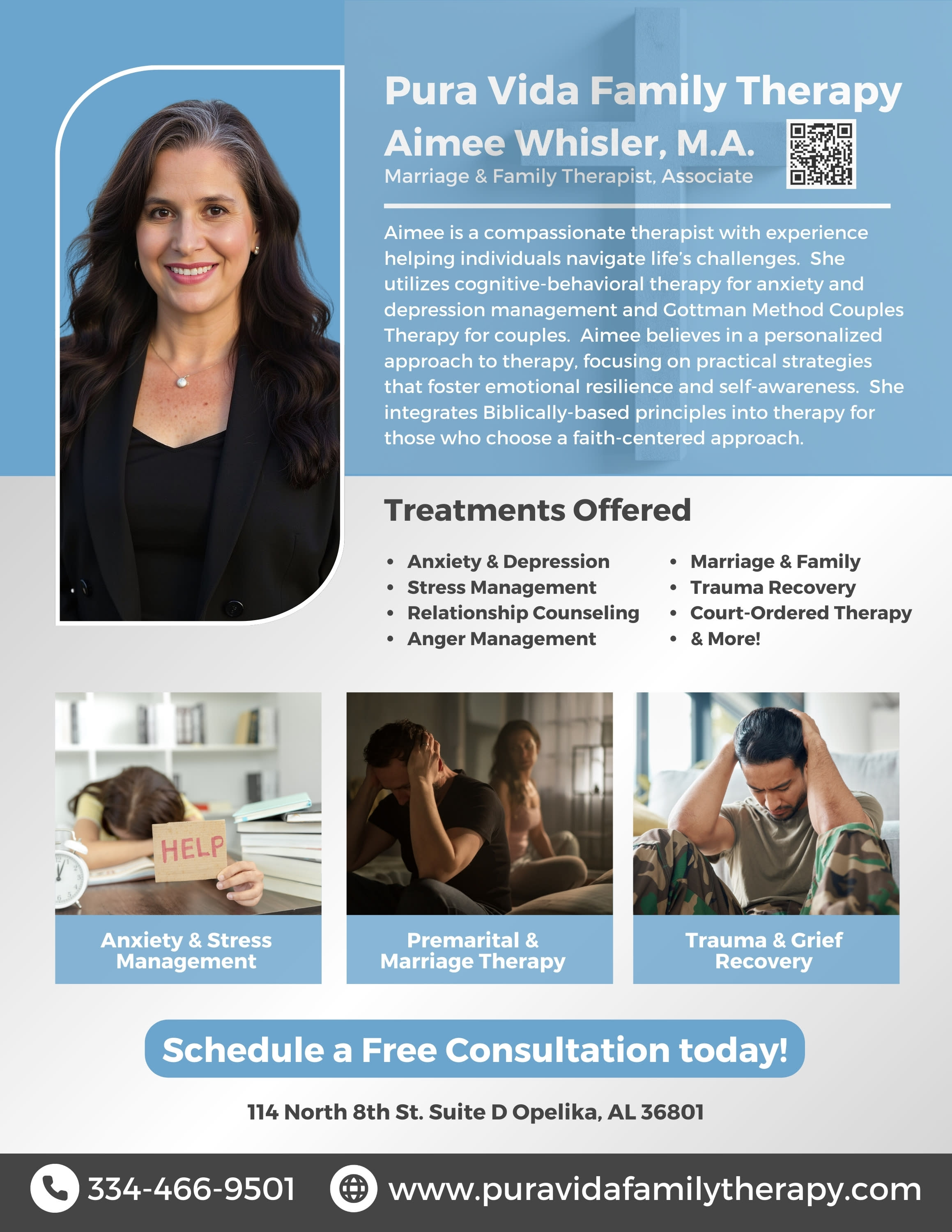 Pura Vida Family Therapy is a locally owned counseling practice in Opelika, Alabama, founded and led by Aimee A. Whisler, Marriage & Family Therapist Associate. The practice specializes in couples counseling, family therapy, parenting support, and work with high-conflict or court-involved families. Aimee provides services in both English and Spanish and offers faith-integrated counseling for clients who desire a Christian-informed approach. Her work is compassionate, practical, and evidence-based, drawing from trusted methods such as the Gottman Method and trauma-informed care. In-person and telehealth services are available.
